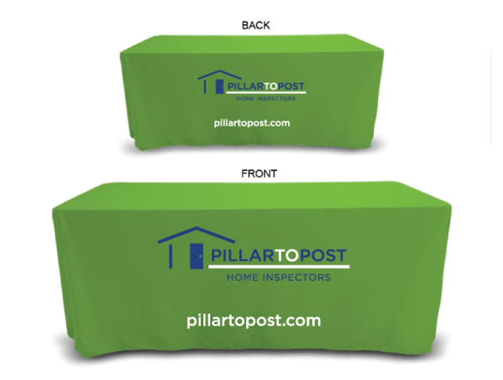 Four-sided 6' table cover creates a lasting impression. Simple storage. Closed back makes it easy to hide materials underneath table. Lightweight, convenient for travelling and shipping. This table cloth will fit a standard 6' table. Machine washable and wrinkle resistant. Compliant with flame retardants for exhibit halls. Each end of the tablecloth includes the Pillar To Post logo.