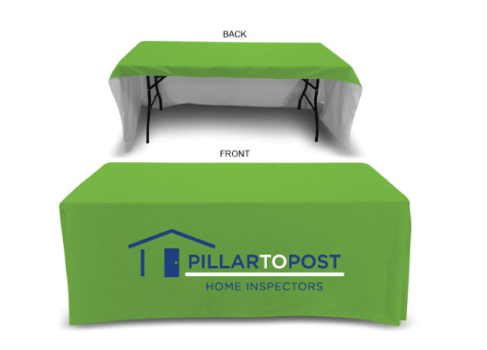 Three-sided table cover creates a lasting impression. Simple storage. Open back makes it easy to store materials underneath table. Lightweight, convenient for traveling and shipping. This table cloth will fit a standard 6' table. 100% Polyester. Machine washable and wrinkle resistant. Compliant with flame retardants for exhibit halls. Pillar To Post logo included on each end of tablecloth.